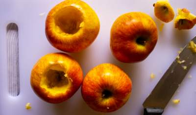 Either use a sharp paring knife with a spoon or simply an apple corer to core the apples. I used a sharp paring knife. First, hold the apple steadily with your hand and keep it on a cutting board. Now Cut around the core about halfway into the apple. Now use a spoon to dig out this core. This step requires a bit of patience. Once you've taken out the core, use a spoon to scoop out any leftover seeds.