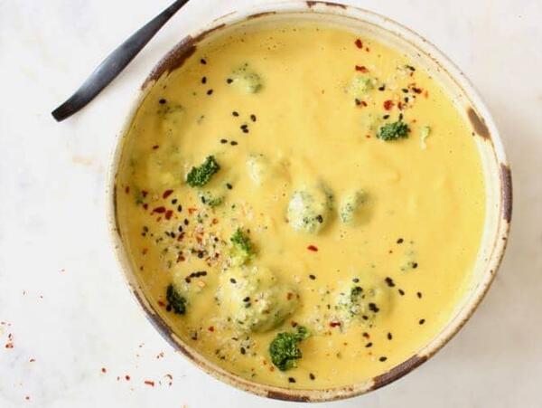 Transfer the creamy soup back to the pot and bring to a simmer again. Add the broccoli florets, cover with a lid and cook a few more minutes until the broccoli is softened to your liking. Take good care not to overcook it, 3 to 5 minutes should yield that perfect al dente texture. Alternatively you can steam the broccoli separately while your soup is cooking.