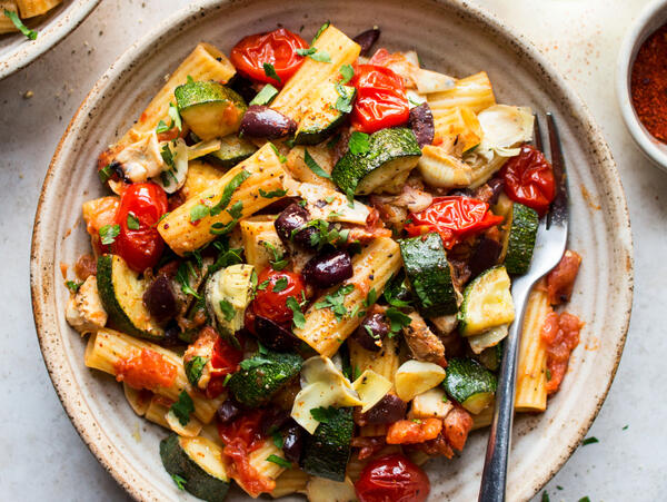 Add drained pasta to the sauce and a bit of pasta cooking water if needed. Coat the pasta in the tomato sauce. Mix well and adjust the seasoning if needed – remember that olives will add saltiness. At this point you may want to add a touch more olive oil for a more luxurious finish.